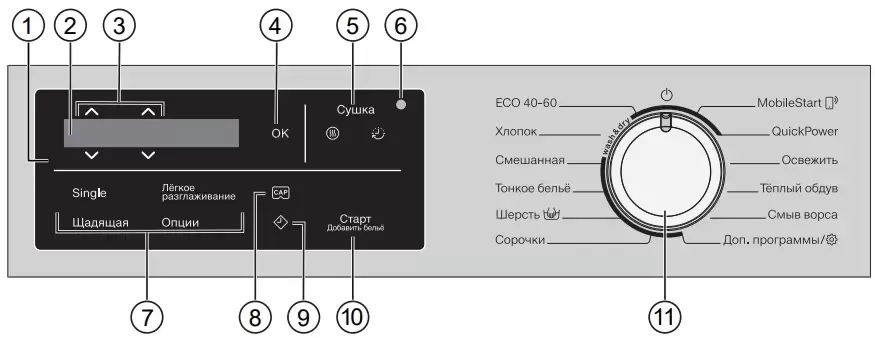 | Дополнительные программы | Без слива QuickPower ECO 40–60 Single Wash&Dry Дополнительные программы сушки: QuickPower Автоматическая Хлопок Eco Тонкое белье Сорочки Шелк Экспресс Верхняя одежда Пропитывание Спортивное белье Спортивная обувь Теплый обдув ECO 40–60 |