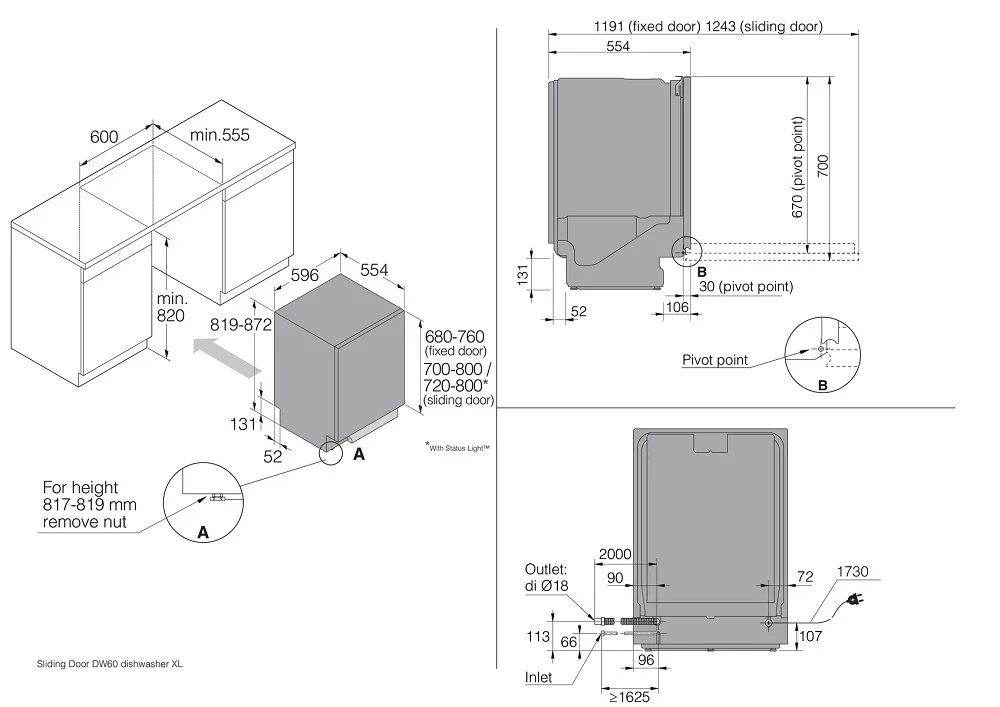 | Дополнительные параметры | 3 уровня загрузки Циркуляционный и сливной насосы оснащены бесшумными асинхронными двигателями Температура мойки от 51 до 70°C Встроенный антисифон Status Light™: индикация состояния с цифровой проекцией |