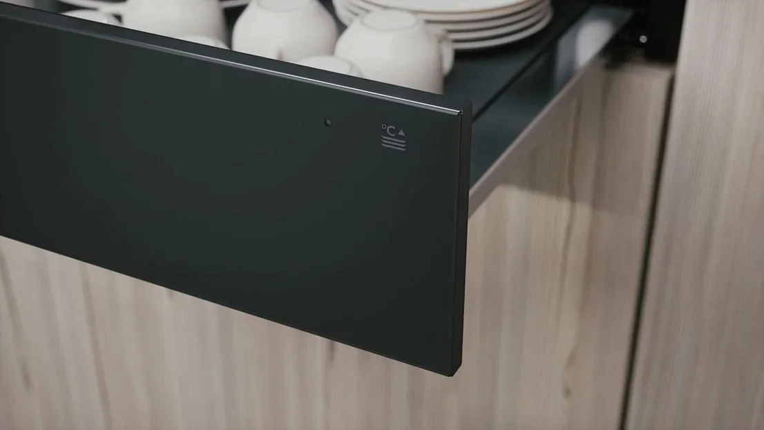 Графит — глубокий тёмно-серый цвет, нечто среднее между чёрной сталью и Pearl Grey. Матовая фактура с антибликовой обработкой. Графит идеален для современных кухонь с серой палитрой, для проектов с натуральным деревом и тёмными акцентами, для скандинавского минимализма с тёмными элементами. Идеальная пара с духовыми шкафами Asko OCS8678GG (Pearl Grey) или OCM64GSH (Frame Series 6 Graphite) — единая колонна техники в графитовом исполнении. Внутренняя поверхность из нержавеющей стали — легко моется. Дно ящика из керамического стекла.