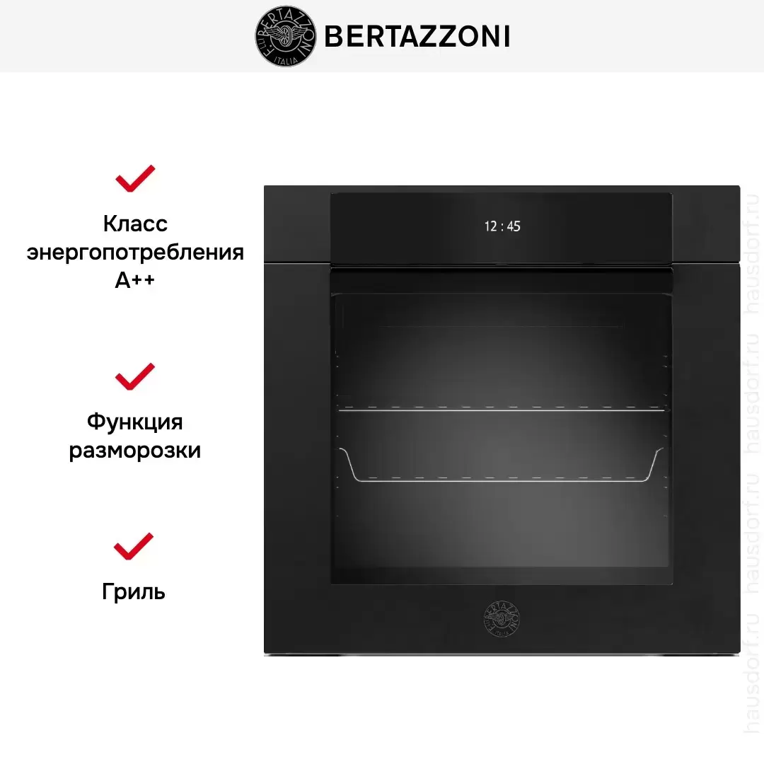 | Дополнительные параметры | Функция Bertazzoni assistant Функция пара Total steam Таймер длительности приготовления Отложенный старт Таймер окончания приготовления Плавное закрытие дверцы 1 уровень телескопических направляющих Двойное боковое освещение Расстойка теста Гидроочистка (очистка паром) и пиролитическая очистка ( с эко функцией) |