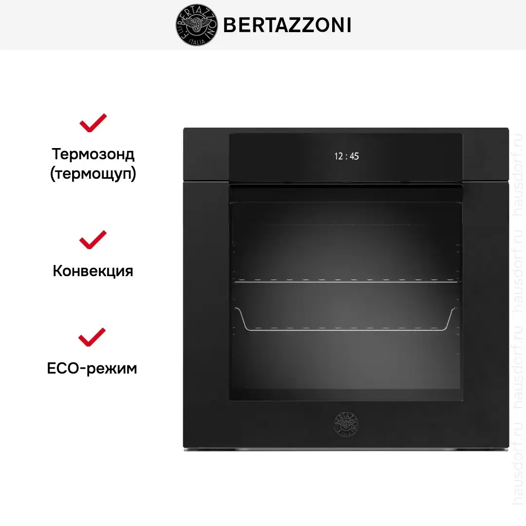 | Дополнительные параметры | Функция Bertazzoni assistant Функция пара Total steam Таймер длительности приготовления Отложенный старт Таймер окончания приготовления Плавное закрытие дверцы 1 уровень телескопических направляющих Двойное боковое освещение Расстойка теста |
