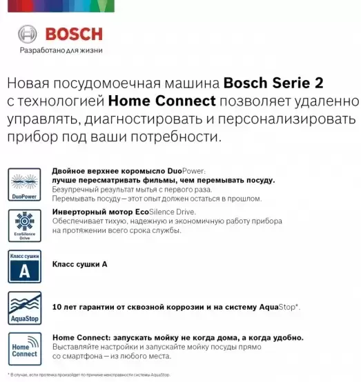 | Дополнительные параметры | Вместимость - 9 комплектов посуды + 1 сервировочный Время работы программы 1, мин: 215 Время работы программы 2, мин: 60 Время работы программы 3, мин: 29 Время работы программы 4, мин: 140 Время работы программы 5, мин: 15 Параметры потребления воды Программа 1: 10 Параметры потребления воды Программа 2: 9.5 Параметры потребления воды Программа 3: 9.5 Параметры потребления воды Программа 4: 12 Параметры потребления воды Программа 5: 4 Потребление воды на программе Эко 50 C°: 10 л Потребление электроэнергии Программа 1: 0.95 Потребление электроэнергии Программа 2: 1.07 Потребление электроэнергии Программа 3: 0.65 Потребление электроэнергии Программа 4: 1.05 Потребление электроэнергии Программа 5: 0.05 Температура Программа 1: 50 Температура Программа 2: 65 Температура Программа 3: 45 Температура Программа 4: 65 Home Connect Home Connect Features: Удаленный мониторинг и контроль Длина отводящего шланга (см): 205 Длина подводящего шланга (см): 165 Длина сетевого кабеля (см): 175 Тип соединения: Wi-Fi Бесщёточный мотор EcoSilenceDrive с инверторным управлением обеспечивает эффективную работу с минимальным уровнем шума и сокращает расход воды Макс. температура поступающей воды (°C): 60 Предохранители (А): 10 Продолжительность цикла на программе Эко 50 C°: 215 мин Расход воды сокращается благодаря её попеременной подаче в верхнее и нижнее коромысло Тип штепсельной вилки: Вилка с заземлением |