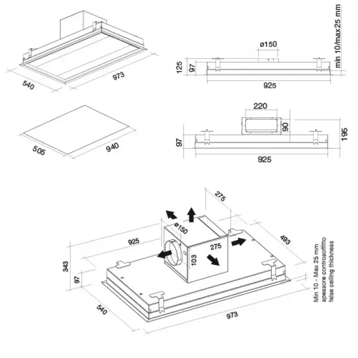 | Дополнительные параметры | Отделка с «эффектом щетки» Периметральное втягивание воздуха Отделка из очень светлого закаленного стекла с трафаретной печатью Минимальное расстояние от варочной поверхности 150 см Поставляется без мотора |