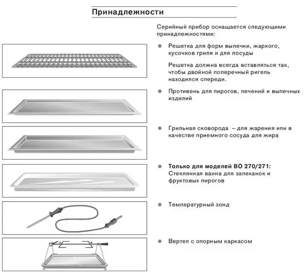 | Комплектация | Решетка, Камень для пиццы, Вертел, Противень для жарки / гриля, Противень (20 мм), Стеклянный противень |