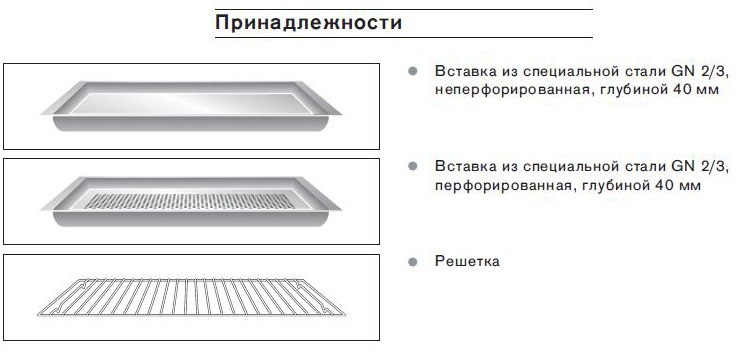 | Комплектация | Решетка, Глубокий противень (40 мм), Перфорированный противень из стали |