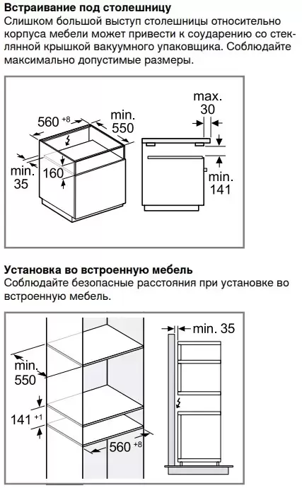 | Дополнительные параметры | 3 уровня вакуумирования в коробе, макс. 99% 3 уровня вакуумирования вне короба, макс. 90% Автоматическое распознавание подключения для внешнего вакуумирования Вакуумирование внешних контейнеров Внешнее вакуумирование жидкостей в бутылках Максимальный размер пакетов для вакуумирования ширина 240 мм x длина 350 мм 3 уровня запаивания для пакетов из материалов разной плотности Запаивающая планка, антипригарное покрытие, съемная Защитная стеклянная крышка, открывается автоматически после вакуумирования Приподнятая вакуумирующая платформа, 44 мм Полезное пространство в коробе для вакуумирования: длина 275 мм х ширина 210 мм Предотвращение вытекания жидкостей во время внешнего вакуумирования Программа сушки Функция предупреждения Необходимо предусмотреть зазор между прибором и фасадом мебели мин. 5 мм Возможность установки BS / BM / CM непосредственно над DV в нишу 59 см без разделительной планки Встраивается под столешницу или в отдельную нишу Розетка для подключения прибора может располагаться непосредственно за прибором |