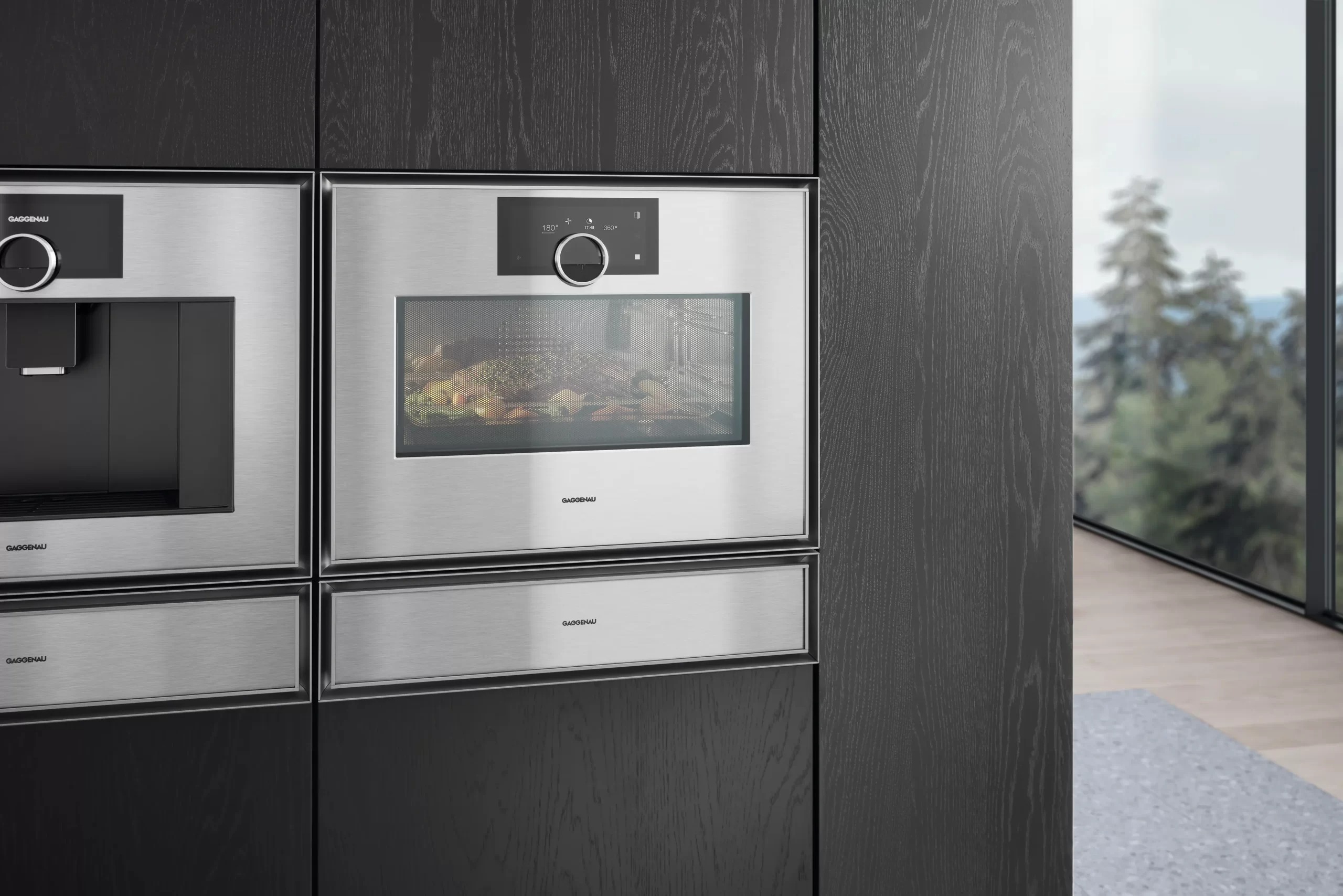 Gaggenau GM 450120 Компактный встроенный духовой шкаф с электрическим нагревом — идеальное решение для современной кухни, где важны стиль и функциональность. Нержавеющая сталь корпуса обеспечивает лаконичный и профессиональный внешний вид, который гармонично впишется в интерьеры с минималистичной или индустриальной эстетикой. Высота 456 мм, ширина 594 мм и глубина 532 мм при ширине встраивания 56 см делает прибор удобным для установки в стандартную нишу размером 560×550×450 мм, при этом объем камеры 46 л сохраняет достаточно рабочего пространства для приготовления разных блюд. Гаггенау GM 450120 предлагает интуитивное сенсорное управление с компактным дисплеем и сенсорными переключателями, что делает интерфейс простым и аккуратным: настройки выполняются без механических ручек, а таймер и отображение температуры обеспечивают точность при приготовлении. Функция HomeConnect расширяет возможности управления и позволяет интегрировать духовой шкаф в умную экосистему кухни для удаленного контроля и удобства. Набор режимов включает 9 вариантов работы: СВЧ, гриль, конвекция, поддержание температуры и сочетание гриль+конвекция, что дает гибкость в выборе оптимального режима под разные рецепты — от разогрева и быстрого приготовления с помощью СВЧ (мощность 1000 Вт) до румяной корочки под электрическим грилем. Конвекция равномерно распределяет тепло по камере, а диапазон рабочих температур от 30 до 230 °C позволит как медленно поддерживать тепло, так и прожаривать при высоких температурах. При мощности до 2,65 кВт духовка демонстрирует энергоэффективность и производительность в компактном формате. Отсутствие вертела компенсируется эффективной работой гриля и конвекции, а наличие таймера и функции поддержания температуры упрощают приготовление сложных блюд. В комплекте поставки идут духовой шкаф, решетка и противень, а также документация — весь необходимый набор для немедленной установки и начала эксплуатации. Продуманная безопасность включает блокировку от детей и автоотключение, что снижает риски при эксплуатации. Дверца навесная с открыванием направо и предусмотренный кабель длиной 1,75 м делают установку и подключение более гибкими. Компактные габариты и продуманный набор функций превращают прибор в универсальный инструмент для современной кухни. Компактные размеры 45.6×59.4×53.2 см и ниша 560×550×450 мм позволяют встроить духовой шкаф в кухню 56 см без потери функциональности. Сенсорное управление с дисплеем и поддержка HomeConnect обеспечивают удобное удаленное управление режимами СВЧ, гриль и конвекция. Безопасность и удобство: блокировка от детей, автоотключение, навесная дверь направо и кабель 1,75 м для простоты установки. Gaggenau GM 450120 Компактный встроенный духовой шкаф с электрическим нагревом — идеальное решение для современной кухни, где важны стиль и функциональность. Нержавеющая сталь корпуса обеспечивает лаконичный и профессиональный внешний вид, который гармонично впишется в интерьеры с минималистичной или индустриальной эстетикой. Высота 456 мм, ширина 594 мм и глубина 532 мм при ширине встраивания 56 см делает прибор удобным для установки в стандартную нишу размером 560×550×450 мм, при этом объем камеры 46 л сохраняет достаточно рабочего пространства для приготовления разных блюд. Гаггенау GM 450120 предлагает интуитивное сенсорное управление с комп