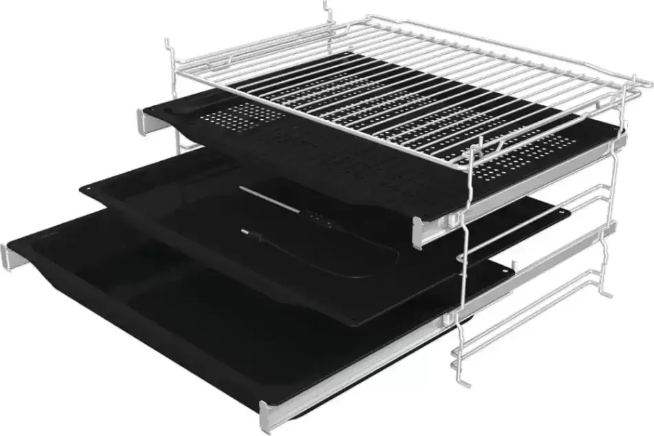 | Комплектация | Телескопические направляющие неполного выдвижения Телескопические направляющие (2-уровневые) Решетка Термощуп Глубокий противень Перфорированный противень из стали Мелкий противень |