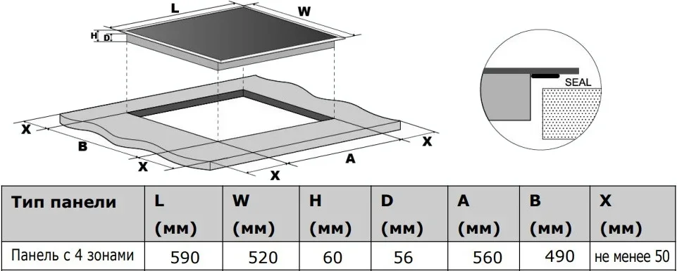 | Размеры ниши для встраивания (Ш х Г), см | 56х49 |