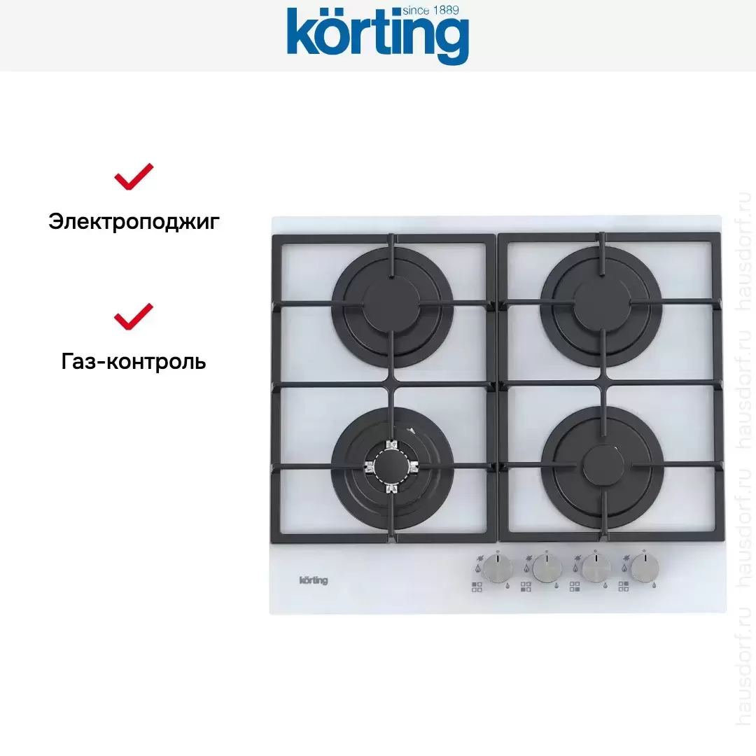 Газовая стеклянная варочная панель Korting HGG 6722 CTW — варочная панель премиум-класса, итальянского производства, сочетающая надёжность и передовые технологии Korting.