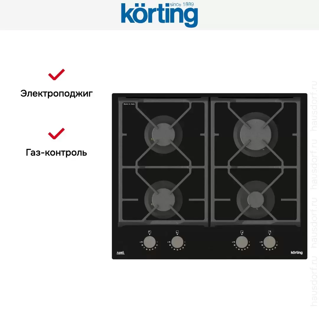 Газовая стеклянная варочная панель Korting HGG 6985 CN FLC — варочная панель премиального сегмента, итальянского производства, сочетающая надёжность и передовые технологии Korting.
