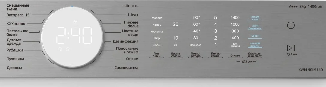 | Дополнительные параметры | Функция Stream Rinse (дополнительный приток чистой воды внутри барабана на этапе полоскания) Функция Турбо+ (сокращает время выполнения выбранной программы) |