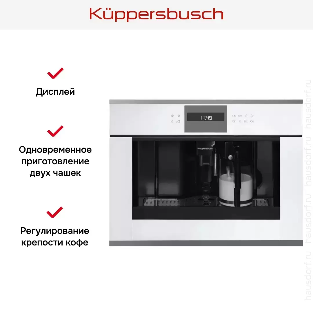 | Дополнительные параметры | Размеры прибора (Ш x В x Г): ≈ 595 x 455 x 475 мм (вкл. фасад 20 мм и телескопические направляющие) Тип установки: Встраиваемый Возможность выбора крепости кофе (5 предварительно заданных уровней) Емкость для воды заполняется спереди Количество программ: 5 Программируемое время включения 3 температуры кофе на выбор Съемный контейнер для молока с функцией очистки Функция подачи молока для приготовления капучино или латте Электронный таймер с белыми индикаторами |