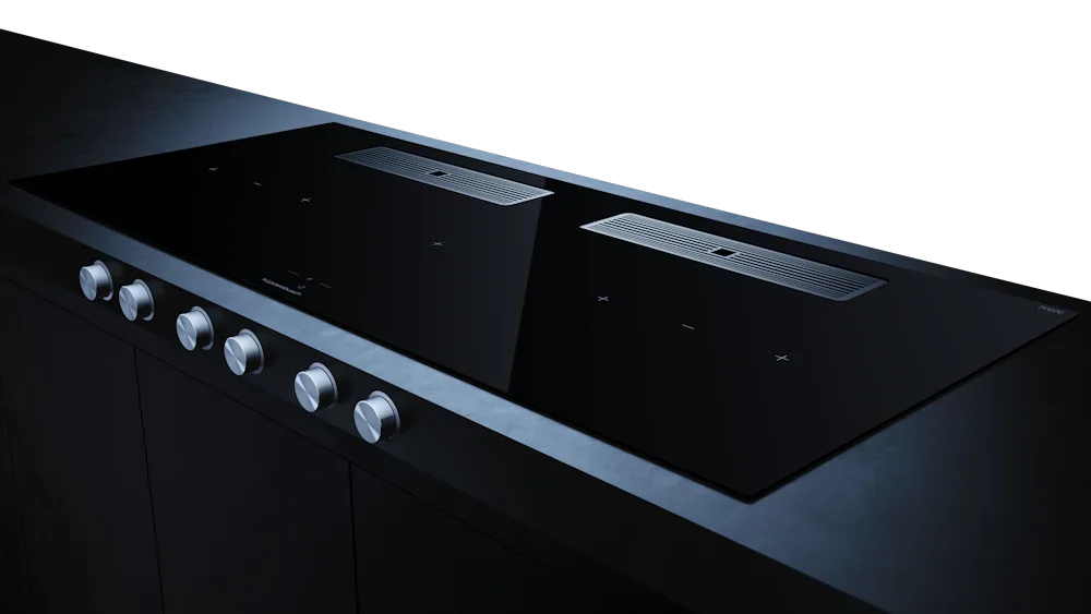 Индукционная варочная поверхность с вытяжкой Kuppersbusch KMI 12850.0 SR-E Silver Chrome — варочная панель премиального сегмента, немецкого производства, сочетающая надёжность и передовые технологии Küppersbusch.