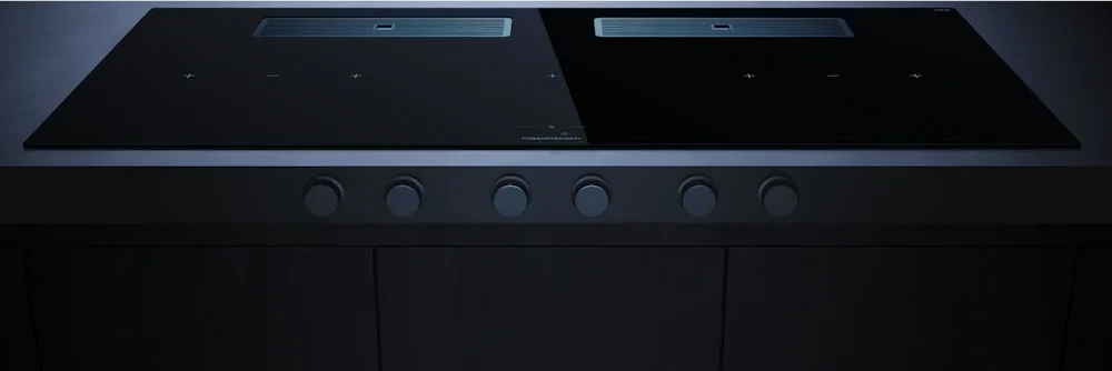 Индукционная варочная поверхность с вытяжкой Kuppersbusch с чёрными ручками KMI 12850.0 SR-S Stainless steel — флагманская модель в линейке Küppersbusch (немецкого производства), варочная панель премиум-класса.