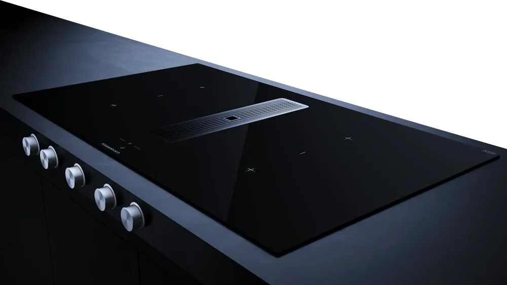 Индукционная варочная поверхность с вытяжкой Kuppersbusch с ручками из нержавеющей стали KMI 9850.1 SR-E Stainless steel — варочная панель премиум-класса от немецкого производителя Küppersbusch.