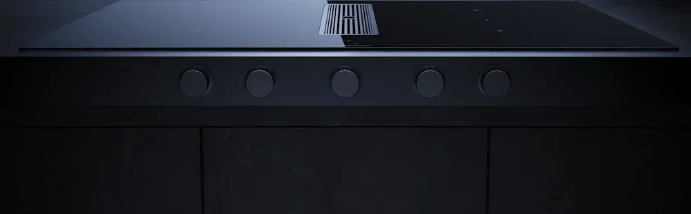 Индукционная варочная поверхность с вытяжкой Kuppersbusch с чёрными ручками KMI 9850.1 SR-S Stainless steel — варочная панель премиального сегмента от немецкого производителя Küppersbusch.