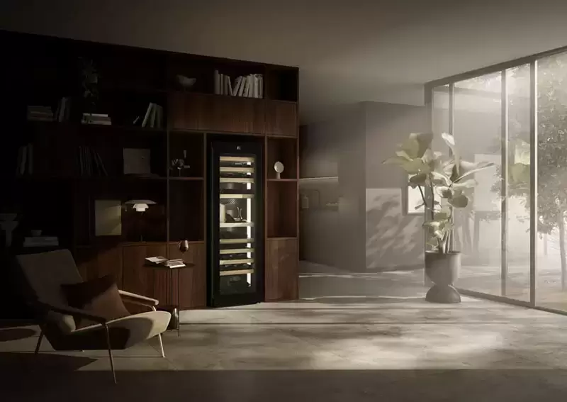 | Дополнительные параметры | Настройка языка: настраивается на устройстве Управление: Touch & Swipe 1 демонстрационная полка Сухая задняя панель: черная сталь Материал боковых стенок: черная сталь Сменный уплотнитель двери Транспортировочные ручки впереди и сзади Ролики для транспортировки сзади Вентиляция через лицевую панель Система загрузки EasyFill Доска для сомелье |