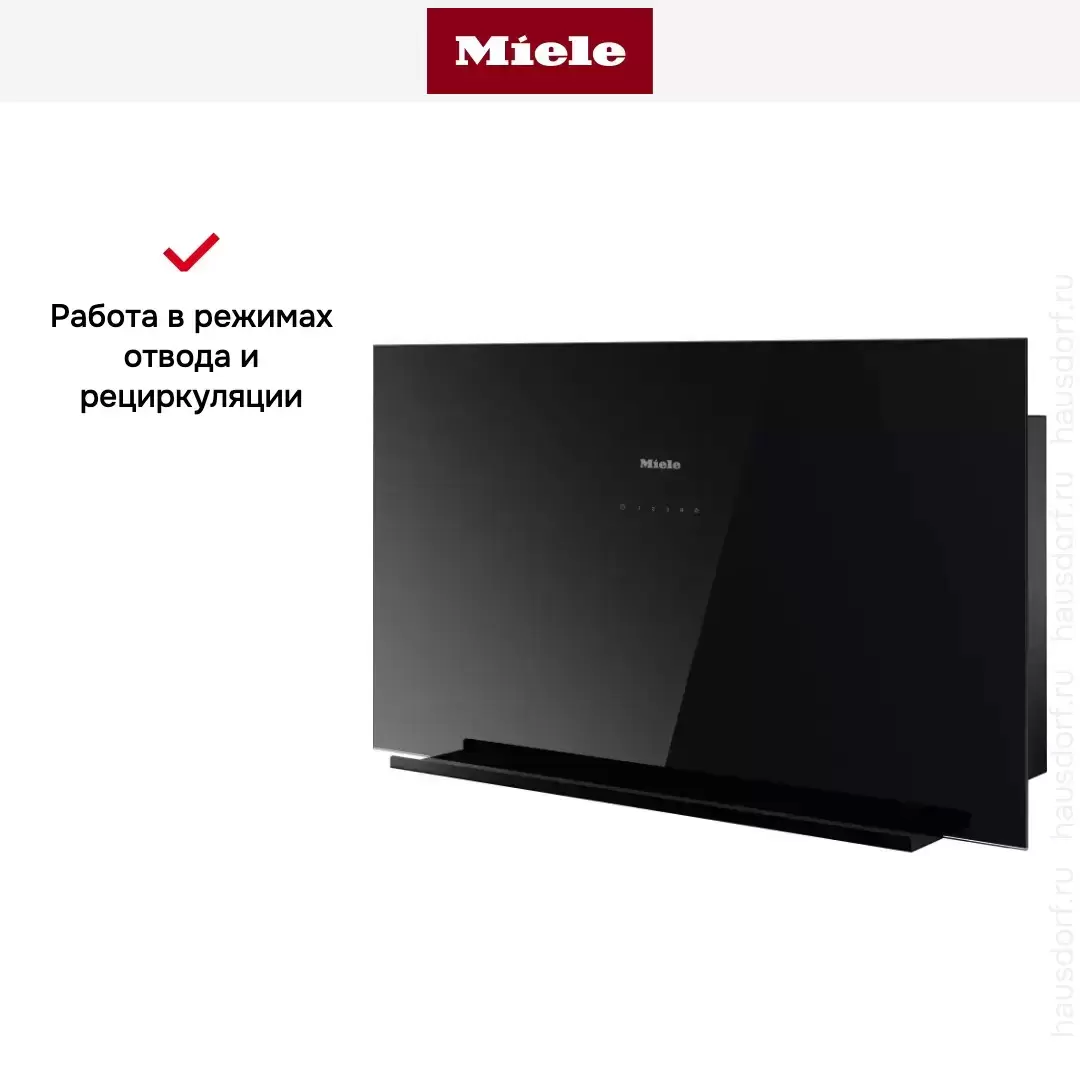 Con@ctivity 3.0 — Bluetooth-связь с индукционной или газовой плитой Miele. При включении плиты вытяжка запускается автоматически, при изменении мощности конфорок подстраивает скорость. RunOnTime — вытяжка работает 5-15 минут после выключения плиты. Interval Ventilation — автоматическое проветривание кухни раз в час для свежего воздуха.