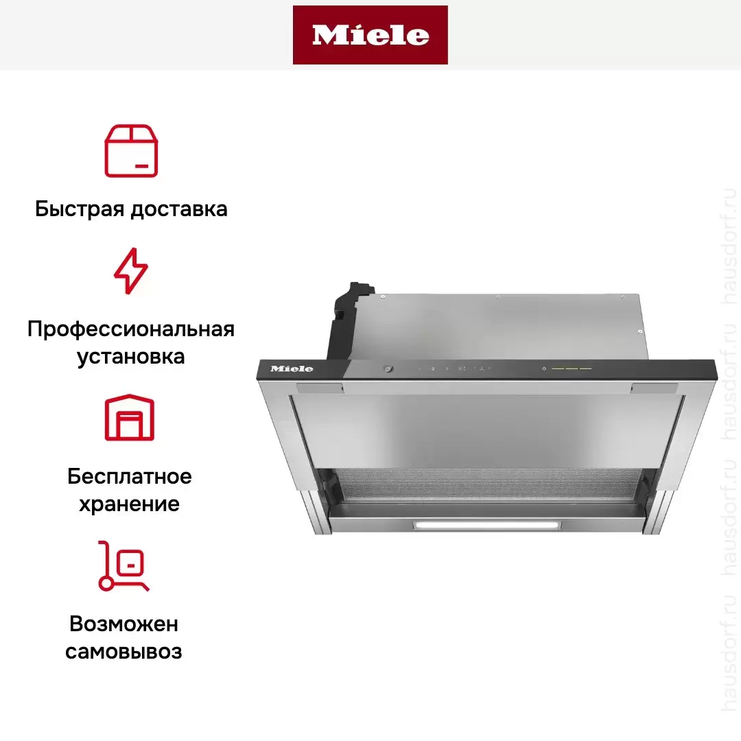 Габариты 600×335×310 мм. Встраивание в нижний шкаф над плитой. Воздуховод 150 мм. Электропитание 220-240 В, 16 А. Мощность 265 Вт. Шум 41 дБ на 1-й, 57 дБ на максимуме. Класс A+. Сборка Miele (Германия). Brera — авторизованный дилер Miele в Москве: официальная гарантия 2 года от импортёра, доставка по Москве и подключение сертифицированным мастером Miele в день доставки включены в стоимость.
