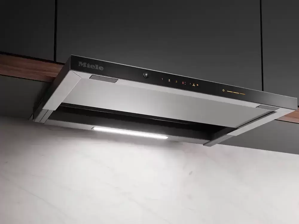 Датчик пара в корпусе вытяжки измеряет концентрацию испарений. При увеличении — повышает скорость, при снижении — понижает. Работает с любой плитой (не только Miele). Освобождает пользователя от ручной регулировки.