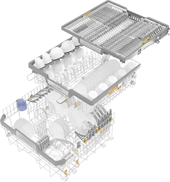 Камера из нержавеющей стали стандартной высоты (44 см). Верхняя корзина 3D MultiFlex Plus. Средняя для тарелок до 32 см. Нижняя для кастрюль до 34 см. BrilliantLight LED-подсветка.