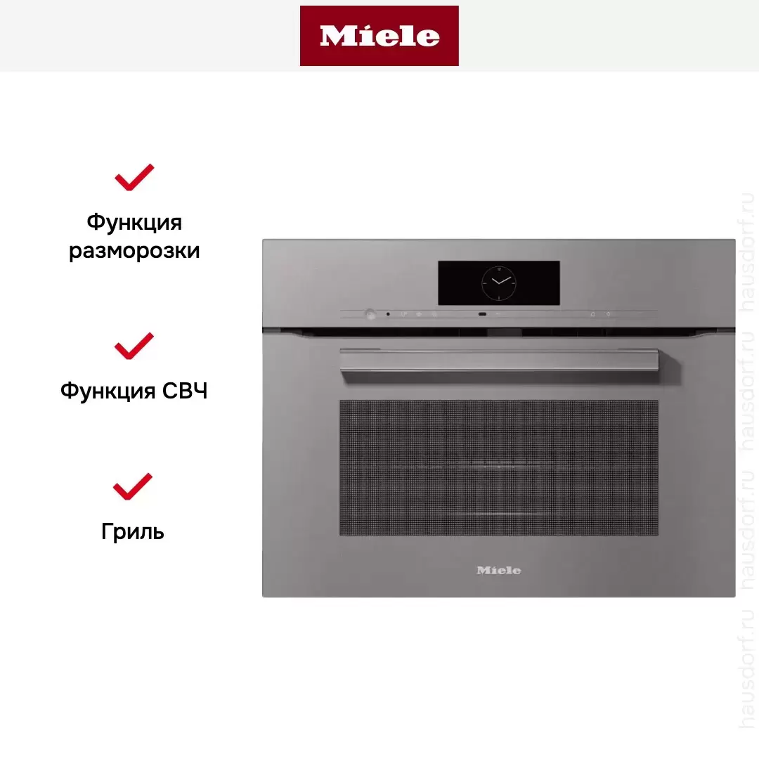 | Другие режимы | Конвекция плюс Интенсивное выпекание СВЧ; СВЧ + Автоматика жарения; СВЧ + Гриль; СВЧ + Конвекция плюс; СВЧ + Гриль с обдувом MyMiele Помощник Рекомендация температуры Быстрый старт |