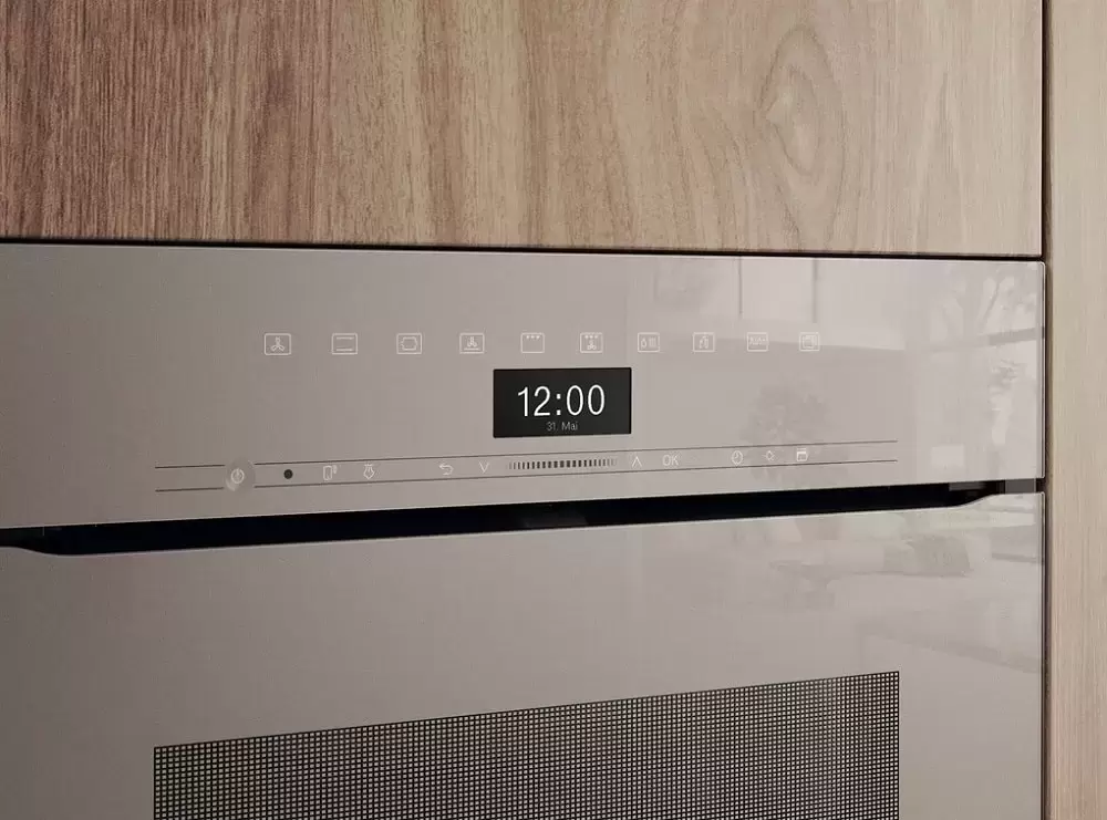 Сенсорный TFT-дисплей M Touch. Wi-Fi Miele@home — удалённый контроль через приложение, уведомления, рецепты. Проводной термощуп с разъёмом в камере. Корпус BPX без ручек с push-to-open: дверца открывается лёгким нажатием, фасад выглядит монолитным. LED BrilliantLight, доводчик SoftClose, FlexiClip-направляющие.
