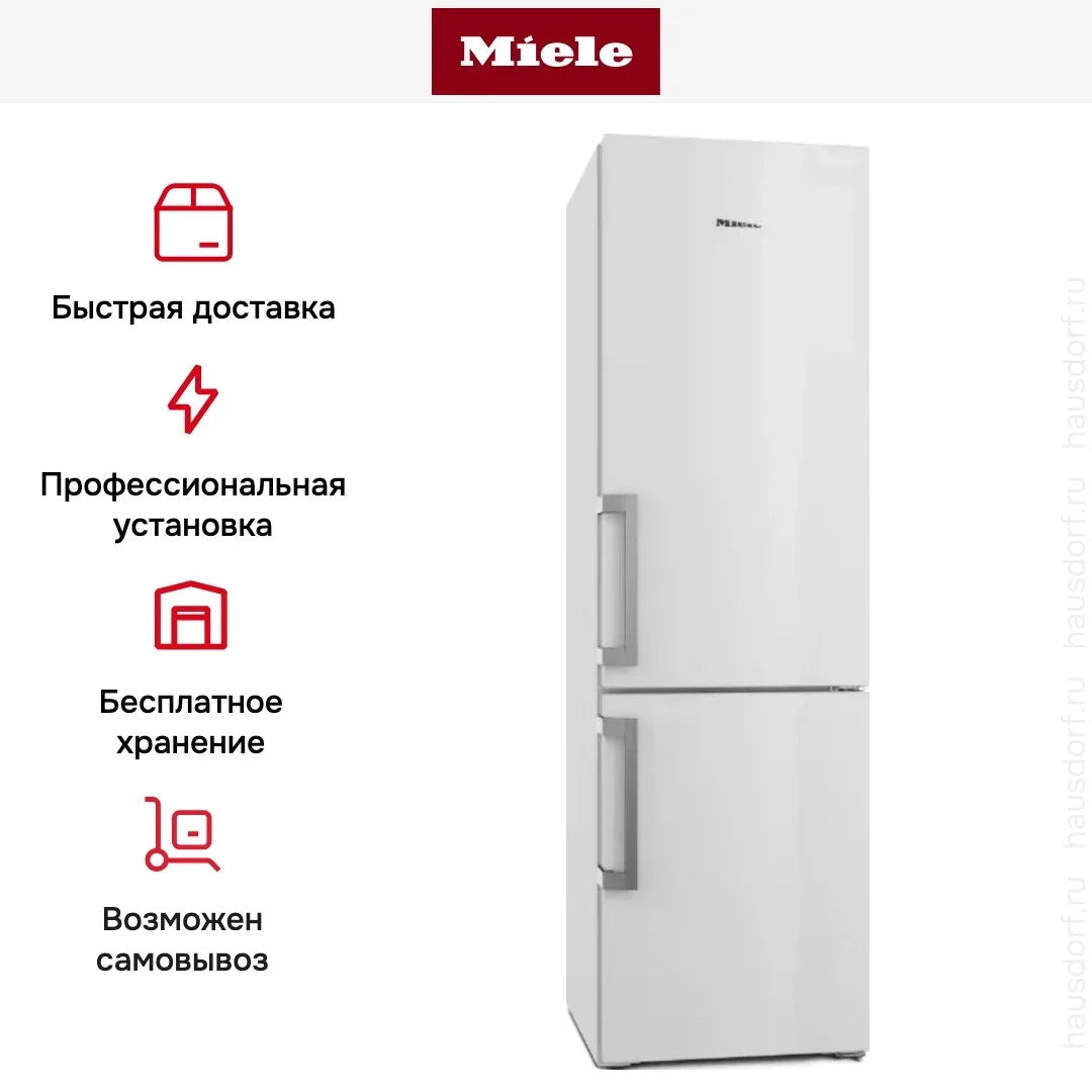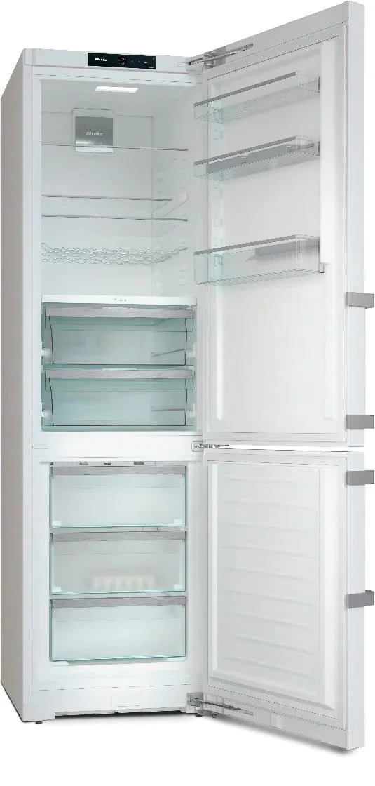 Miele KFN 4797 CD WS — отдельно стоящий (не встраиваемый) комбинированный холодильник с морозильным отделением в белом корпусе (WS — White Standard). Высота 201 см. Дизайн для открытых кухонь и лофтов, где холодильник не прячется за фасадом. Технически близок к встраиваемым KFN 7xxx C, но в самостоятельном корпусе с декоративной передней панелью.