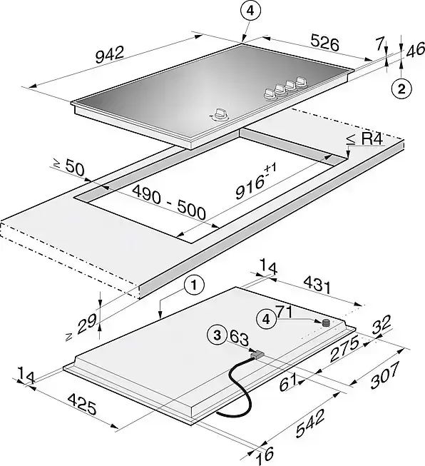 Габариты 906×527 мм, вырез 860×490 мм. Подключение к газовой магистрали — выполняет аккредитованная газовая служба. Электропитание для поджига — 220 В стандартная розетка. Сборка Miele (Германия). Brera — авторизованный дилер: гарантия 2 года. Brera доставляет и координирует подключение газовиками.