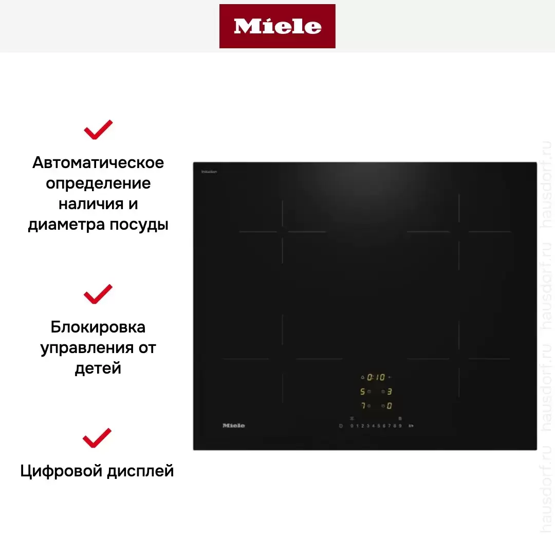 Сенсорная панель DirectSelect — выбор мощности кнопками 0-9 для каждой зоны (упрощённая версия DirectSelect Plus, где вместо кнопок — слайдеры). Wi-Fi Miele@home: удалённые уведомления, мониторинг через приложение. Блокировка от детей, настройка звуков.