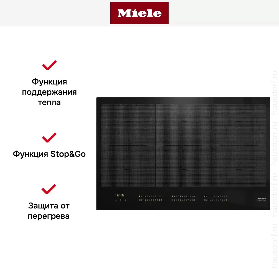 Сенсорная панель DirectSelect Plus с индивидуальными слайдерами мощности для каждой зоны. Wi-Fi Miele@home: удалённые уведомления, мониторинг через приложение. Настраиваемые звуки, яркость дисплея, режим демонстрации.