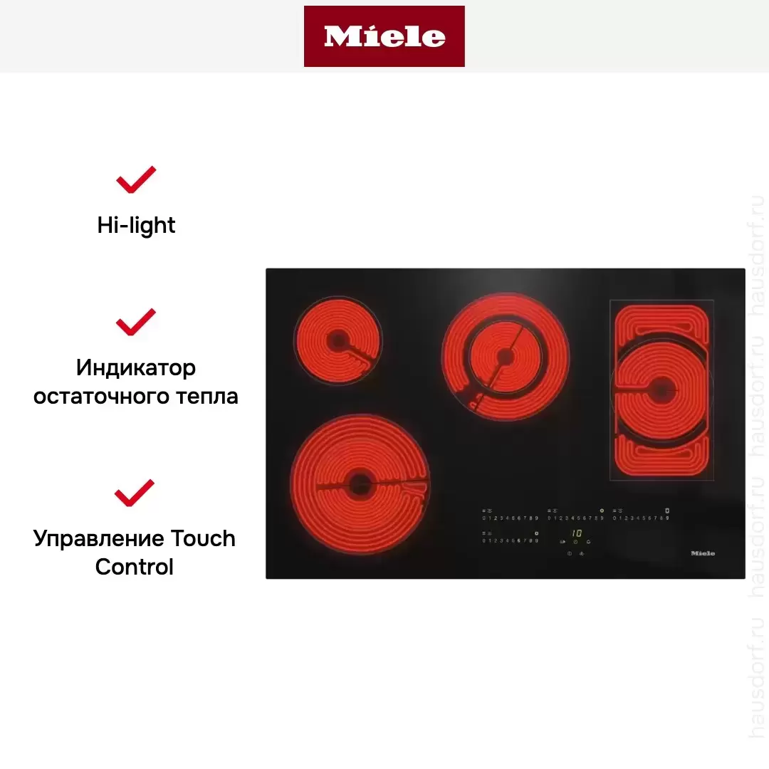 | Дополнительные параметры | Управление SmartSelect с желтой подсветкой, выбором мощности на цифровой шкале для каждой конфорки, c опцией WipeProtection ExtraSpeed Контроль ошибок |