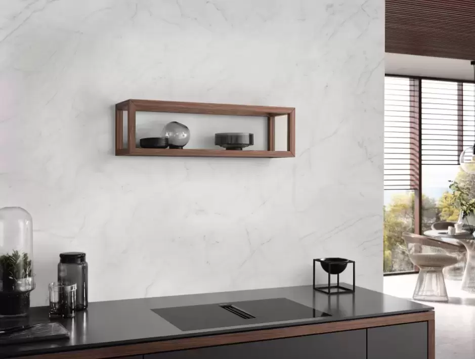 Центральный воздухозаборник всасывает пар у источника. Производительность до 615 м³/ч, 4 скорости плюс интенсивный. Con@ctivity 3.0 автоматически подстраивает скорость под мощность конфорок. Рециркуляция или отвод наружу.