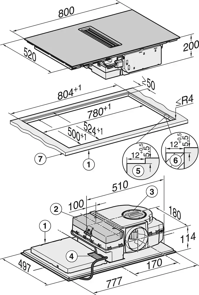Габариты 806×527 мм, вырез для flush 762×491 мм с допуском ±1 мм. Мощность 7,4 кВт + 0,24 кВт — линия 380 В или 220 В 32 А. Столешница — гранит, кварц, спеченный камень. Brera — авторизованный дилер Miele: гарантия 2 года, установка мастером Miele с координацией выреза в камне включены в стоимость.