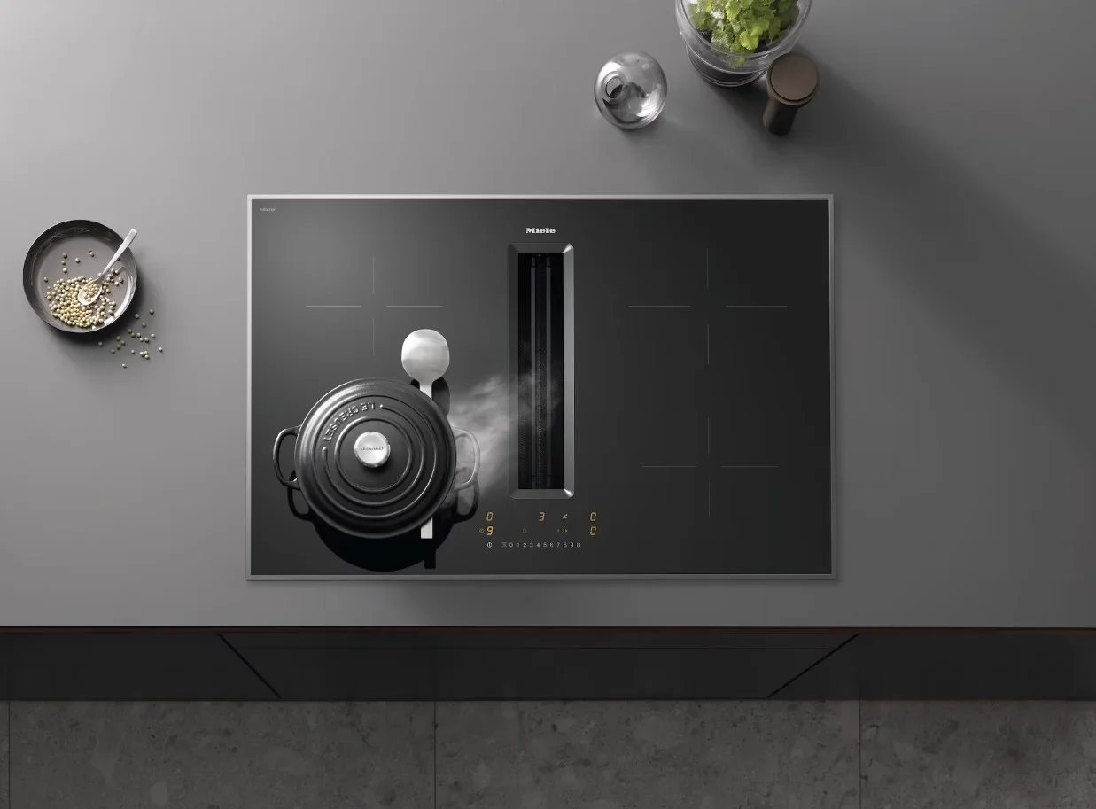 Miele KMDA 7272 FR-U — индукционная варочная панель 80 см с интегрированной вниз направленной вытяжкой в flush-исполнении с лицевой гранью справа (FR — right, U — Under flush). Комбинация «flush + сторона FR» подходит для правосторонних планировок кухни-острова с монолитной каменной столешницей: плита устанавливается вровень со столешницей без перепада, управление справа для удобного доступа с рабочей зоны слева. Функционально идентична KMDA 7272-1 FR, отличие — только тип монтажа.