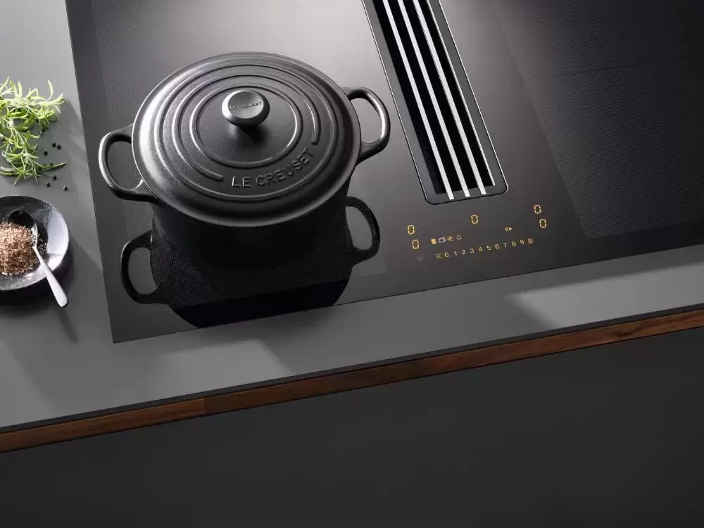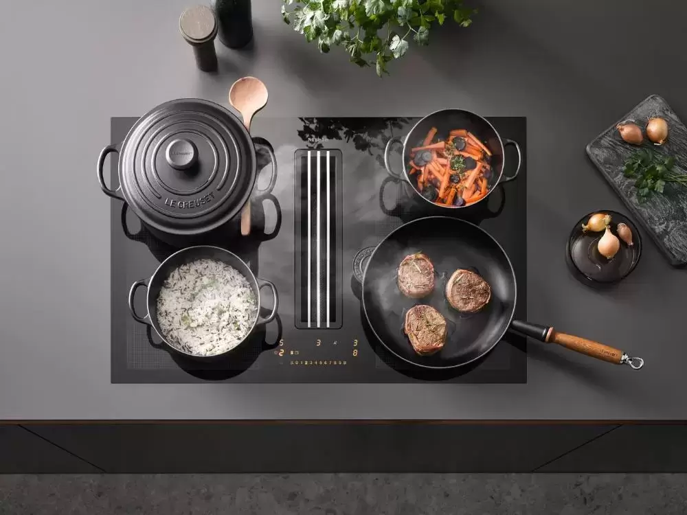 4 индукционные конфорки с регулируемой зоной 150×230 мм каждая, мощность 2,1 / 3 / 3,65 кВт по ступеням и в TwinBooster. Система распознавания посуды автоматически активирует зону под размер дна кастрюли. Зона PowerFlex 230×460 мм объединяет две левые или две правые конфорки в одну длинную зону мощностью 3,4 / 4,8 / 7,3 кВт — под казаны, утятницы, большие противни и сковороды для Teppan-Yaki. Общая потребляемая мощность варочной панели и вытяжки — 7,5 кВт. Годовой расход электроэнергии вытяжки 27,6 кВт·ч.