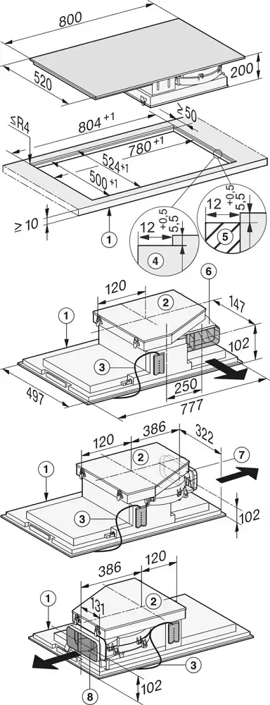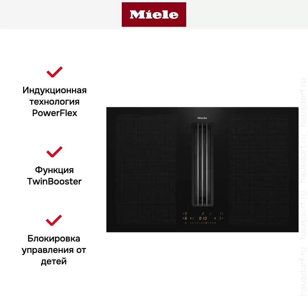 Габариты ниши для встраивания 780×500 мм, высота панели с блоком вытяжки снизу 200 мм. Монтаж накладной или заподлицо со столешницей. Электропитание 220-240 В, кабель 2 м. Класс энергоэффективности встроенной вытяжки A++. Защита от перегрева, блокировка от детей, автоматическое распознавание посуды. Сборка Miele (Германия), расчётный ресурс 20 лет ежедневной эксплуатации. Brera — авторизованный дилер Miele в Москве: официальная гарантия 2 года от импортёра, доставка по Москве и подключение сертифицированным мастером Miele в день доставки включены в стоимость покупки.