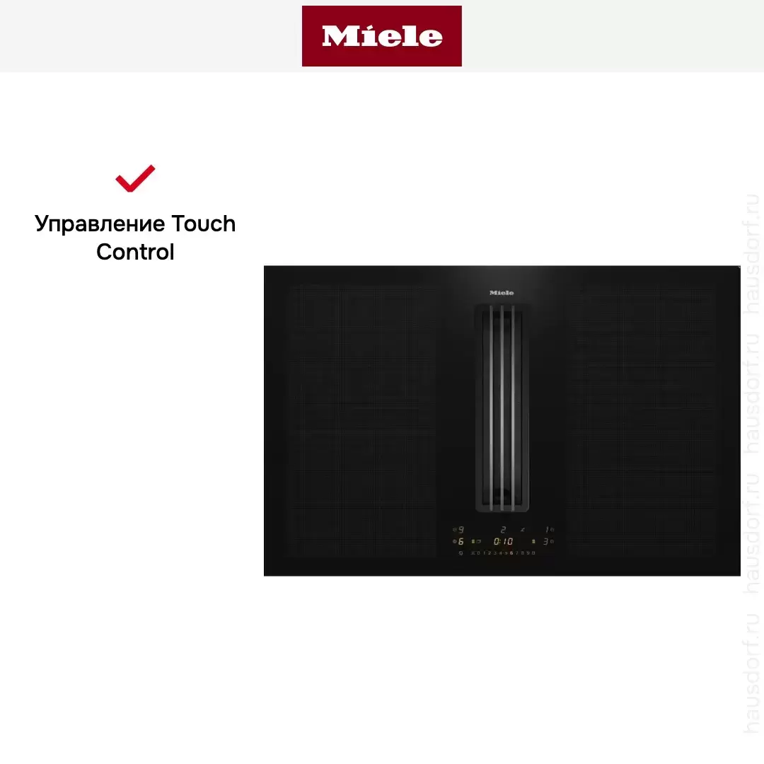 Сенсорное управление TouchControl с прямым выбором мощности тапом по зоне — та же схема, что у KMDA 7476 FR. Цифровой дисплей с индивидуальной подсветкой каждой конфорки. Таймер, автоматика закипания, Stop&Go (пауза одной клавишей), индикатор остаточного тепла, блокировка от детей, защита от перегрева и нечаянного старта. Фронтальное расположение органов управления.