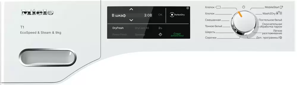 | Дополнительные параметры | Шланг для слива конденсата Функция AddLoad (дозагрузка белья) Выбор языка на дисплее Технология Wash2Dry: автоматическая синхронизация с программой стиральной машины Miele Функция EcoSpeed Функция EcoFeedback |