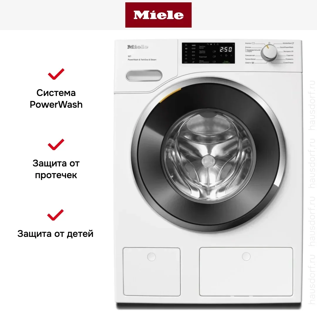 Miele WWG 880 WCS White Edition — стиральная машина Generation W5 с загрузкой 9 кг в белом корпусе. Средний премиум: PowerWash 2.0, Wi-Fi Miele@home, защита от протечек, 20+ программ. От флагманской WWI 860 отличается отсутствием TwinDos автоматического дозирования и SteamCare — использует обычную загрузку порошка/геля. Оптимальная машина для семей, которым не нужны TwinDos и пар.