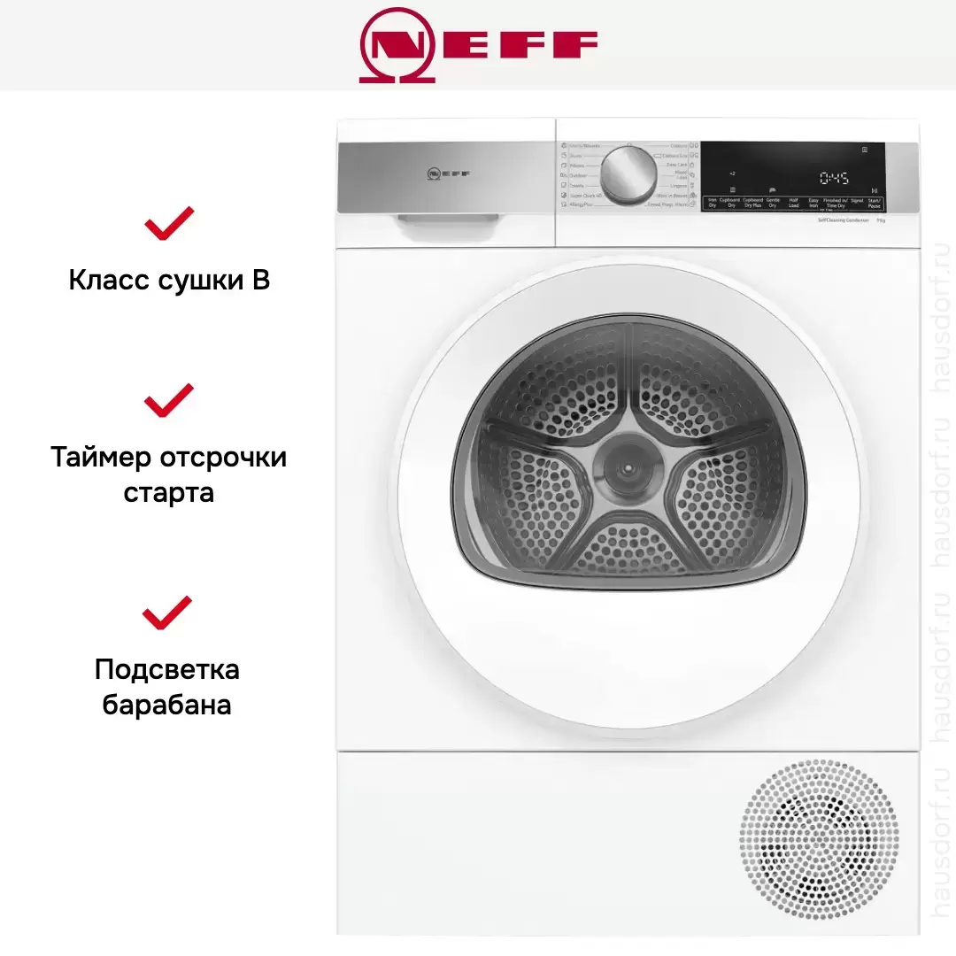 Оснащена сушка по времени, сушка в корзине и самоочистка конденсатора.