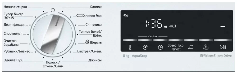Оснащена функцией обычная экспресс-стирка (быстрая, ежедневная, короткая, освежить, экономичная, мини-программа).