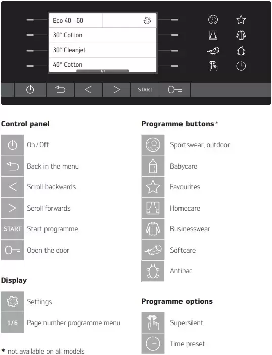 | Дополнительные программы | Короткие программы Swiss: 20-90 градусов (2 нагревательных элемента) Экспресс-программы: 20 минут 3D-Powerclean Хлопок 40 / 60°C Очистка пластиковых игрушек Остановка полоскания Избранное: 6 программ в памяти устройства |
