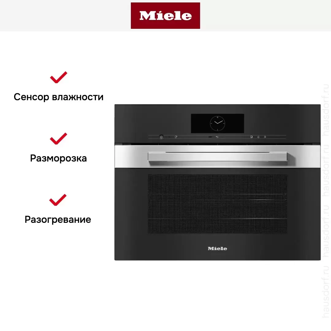 | Дополнительная информация | Индивидуальные настройки влажности для комби-приготовления Приготовление блюд меню без смешивания вкусов и запахов Автоматические программы Mix&Match Автоматические программы с индивидуальной настройкой процесса приготовления Функция Crisp function Автоматические программы для конкретных стран Комби-приготовление Специальные программы для редких рецептов Функция отвода пара перед окончанием приготовления Приготовление на пару на 3 уровнях одновременно Режим Шаббат Датчик движения MotionReact: включение дисплея, подсветки или звукового сигнала, распознавание фронтов шкафа Моторизованная панель управления Индикация заданной температуры Рекомендация температуры Полностью откидной ТЭН гриля; ТЭН в днище для уменьшения образования конденсата Программа замачивания Программа ополаскивания Технология DualSteam Система охлаждения испарений Дверной упор слева MyMiele Помощник Время приготовления не зависит от объема |