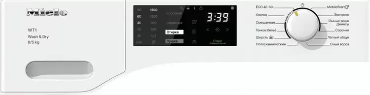 Кнопочное управление с LED-дисплеем. Индикация оставшегося времени стирки и сушки, текущего этапа (стирка / полоскание / отжим / сушка / охлаждение). Без Wi-Fi Miele@home. Защита от протечек WCS (Water Control System) с датчиками в корпусе и поддоне.