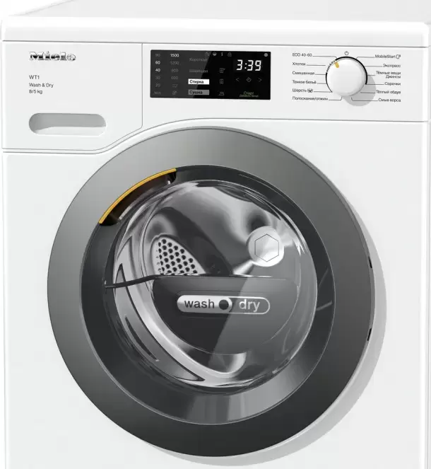 CapDosing — специальные капсулы Miele с моющим для конкретных тканей: шерсть (щадящий уход), спортивная одежда (удаление запаха, восстановление ткани), пух (сохранение объёма наполнителя). Капсула вставляется в отсек, автоматика выдавливает содержимое в нужный момент цикла. Стоимость капсулы 20-30 руб. Конденсационная сушка с тепловым насосом — энергоэффективный режим класса A: вода конденсируется и собирается в резервуар (опорожняется после каждой сушки) или автоматически сливается в канализацию при подключении дренажной трубки.