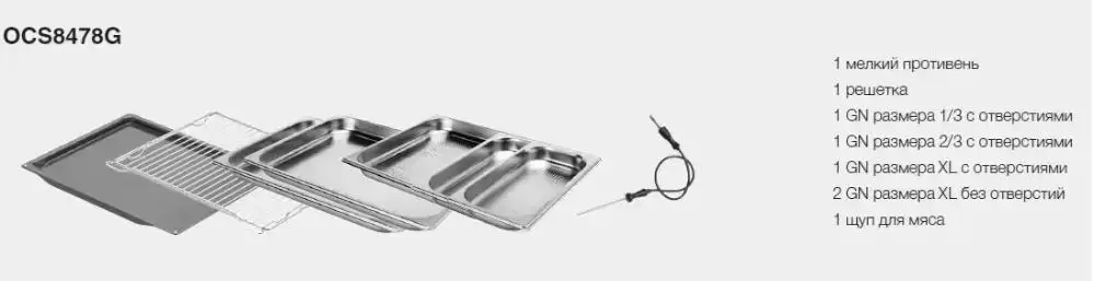 | Дополнительная комплектация | 1 противень для приготовления на пару 1 / 2 ширины 1 противень для приготовления на пару 1 / 3 ширины 2 противня для приготовления на пару полноразмерные (без отверстий) Тип телескопических направляющих: полного выдвижения с функцией тормоза |