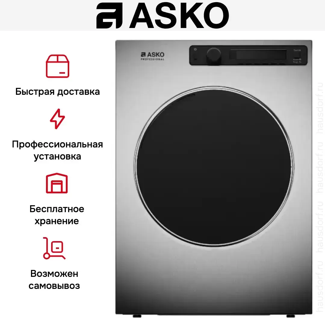 Линейка Professional Asko рассчитана на нагрузку, превышающую обычную домашнюю в 5–10 раз: ежедневные циклы по нескольку раз в день, разнотипное бельё, длительный срок службы. Усиленный корпус, увеличенный ресурс барабана и подшипников, расширенный угол открывания дверцы 180° (для удобной загрузки в стеснённых условиях прачечной), микропроцессорное управление с возможностью настройки длительности программ до 100 часов, чёрные элементы для маскировки следов эксплуатации. Цвет «Нержавеющая сталь» — фронтальная панель из сатинированной нержавейки, устойчива к ежедневной чистке.