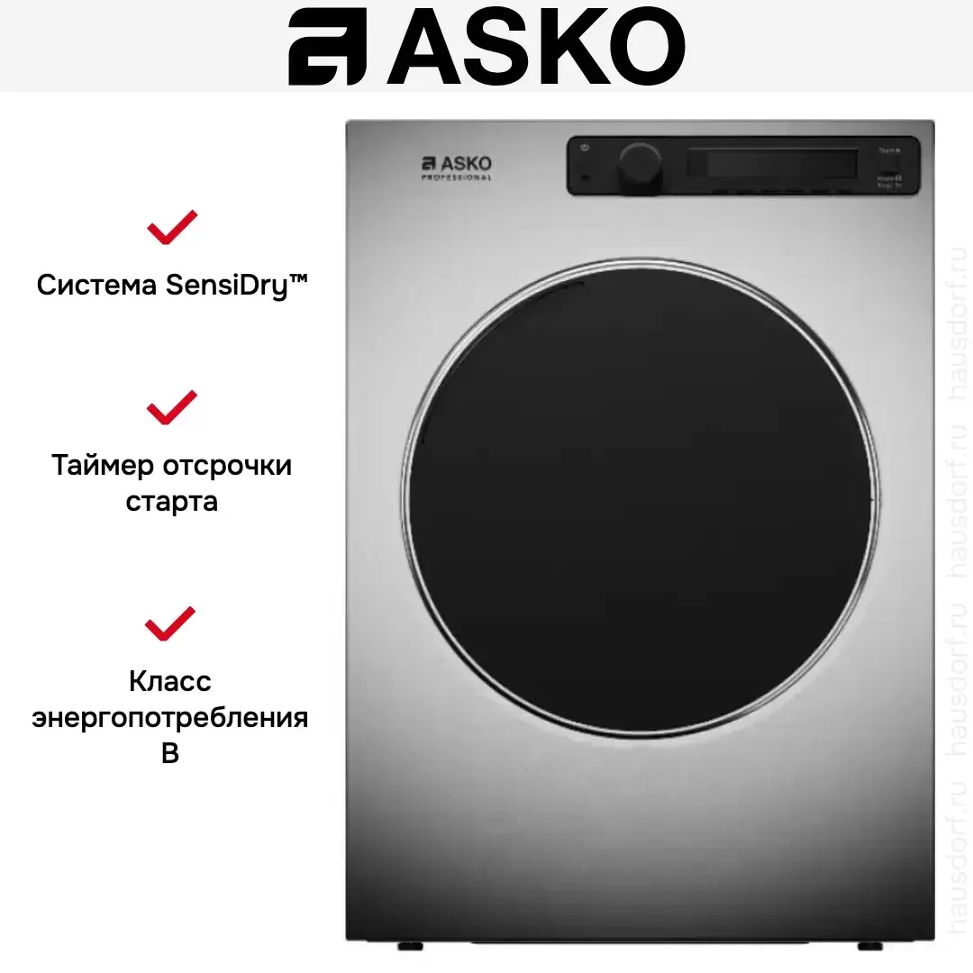 Asko TDC1773VF.S — профессиональная сушильная машина серии Professional с вентилируемой сушкой для прачечных, отелей, спа, фитнес-клубов и небольших коммерческих помещений. Дизайн «Professional» в исполнении нержавеющая сталь с чёрной дверцей и панелью управления. Загрузка 7 кг, барабан 117 л из нержавеющей стали, бесщёточный двигатель BLDC, ЖК-дисплей, поворотный программатор + кнопки, 17 программ сушки, функция антисминания, контроль влажности белья, таймер отсрочки старта от 1 до 100 часов, угол открывания дверцы 180°, возможность установки в колонну или side-by-side, скорость удаления влаги через вентиляцию. Класс энергопотребления B, мощность подключения 3200 Вт, среднегодовое энергопотребление 494,9 кВт·ч.